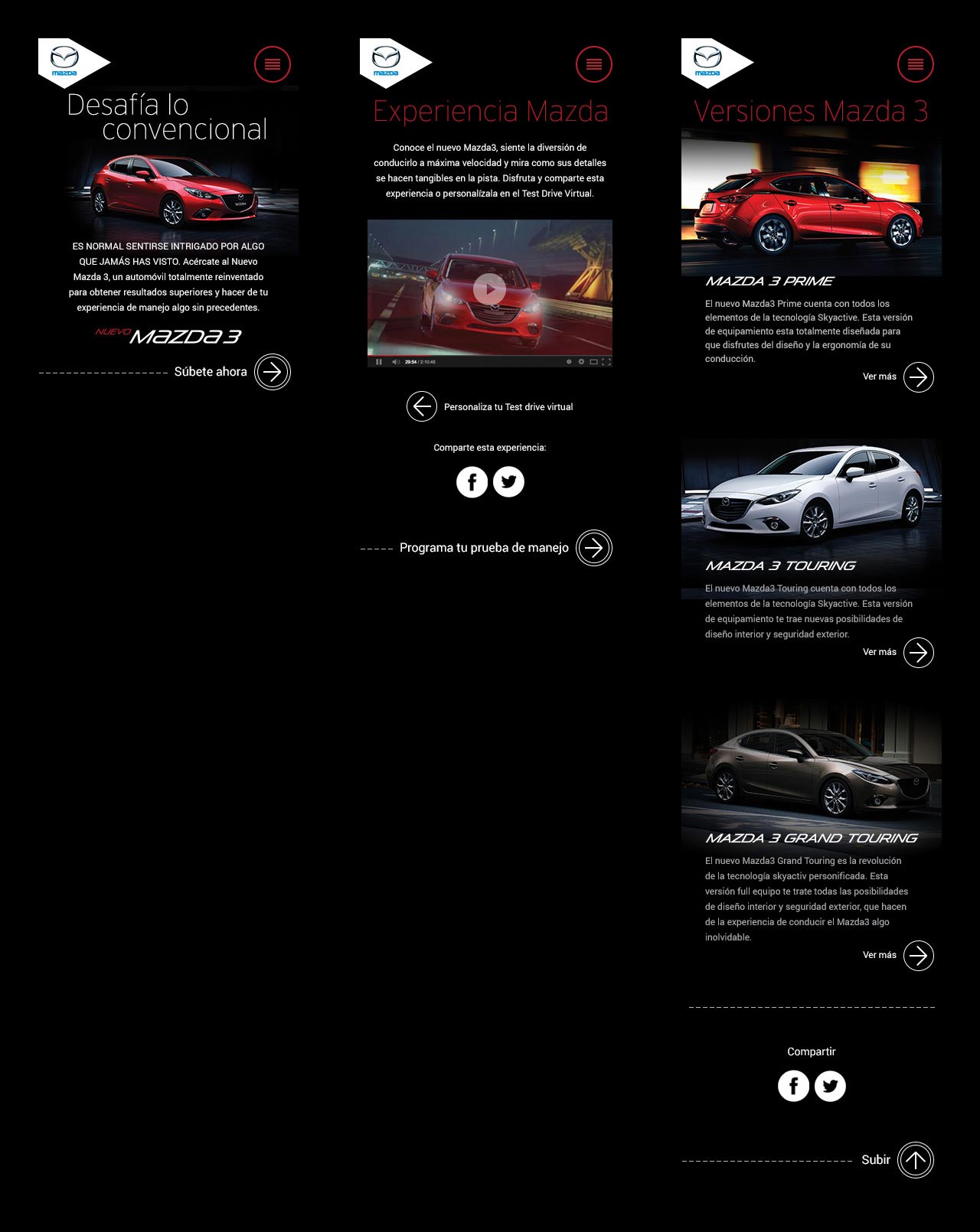 Diseño web / móviles Diseño de la versión para móviles del sitio web de la referencia de automóviles “Mazda 3”. Cliente: VML – Colombia Más proyectos Otros proyectos de diseño web / móviles Más proyectos Web mobile «Mazda»